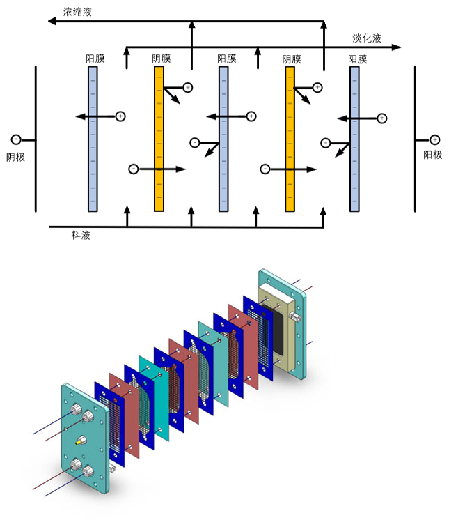 用1張陰離子交換膜、1張淡化室隔板、1張陽離子交換膜和1張濃縮室隔板的交替疊放構(gòu)成了1個(gè)膜對(duì); 若干膜對(duì)疊放一起,兩側(cè)加上電極室隔板則構(gòu)成了膜堆;膜堆兩側(cè)放置電極、配水板及夾緊板則構(gòu)成了電滲析器。 電滲析過程以電場(chǎng)為驅(qū)動(dòng)力,利用離子交換膜對(duì)離子的選擇透過性,使陰離子和陽離子發(fā)生定向遷移,從而實(shí)現(xiàn)水溶液中鹽分的脫除或濃縮。